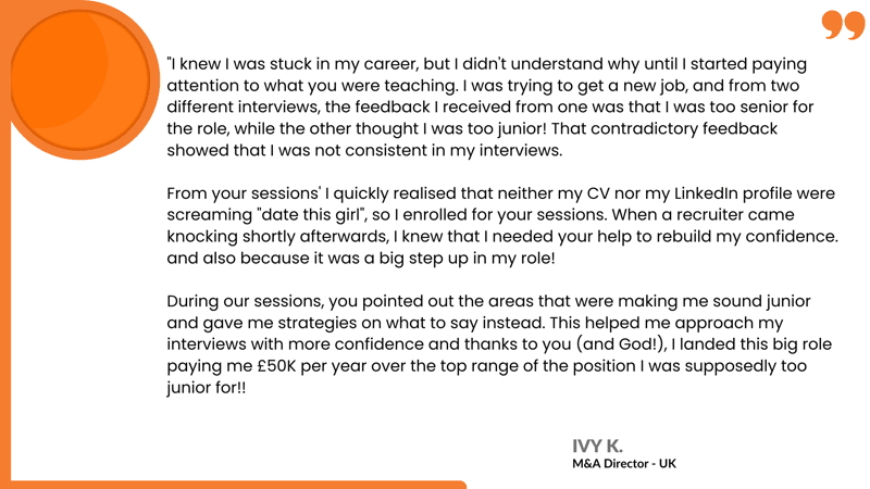 Ivy used the Door Busting Resume & Brand Affirming LinkedIn Program to land her dream role earning £50,000 more per year, than a role she had previously been deemed as "too junior" for.